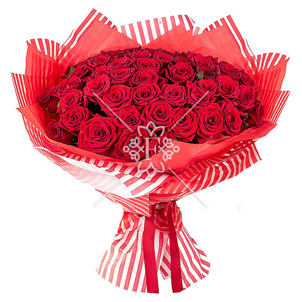 В  этом изумительном  и роскошном букете классические розы красного цвета выглядят по-королевски  благородно.